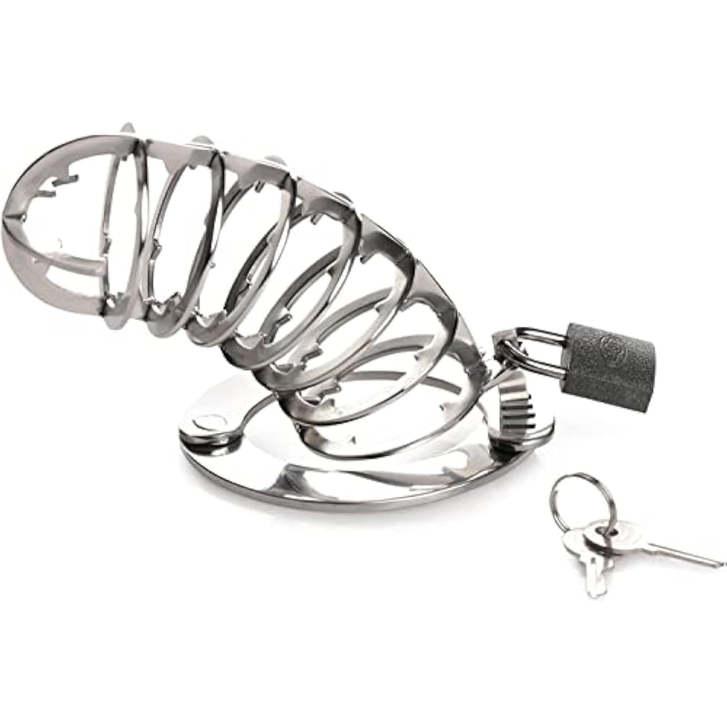 Cold, Hard Steel: This Device Is Made With Strong, Durable Steel So It Makes A Fortified Prison For Your Cock. Non-Porous, Easy To Clean And Built To Last. | | Spiked Cage: On The Inner Rings Are 4 Spikes That Are Evenly Spaced On Each Ring. As You Get Erect, The Spikes Begin To Press Into Your Erection. | | Handcuff Locking Mechanism: The Base Is A Metal Circle With A Hinge So You Can Adjust For A Snug And Secure Fit. Simply Take The Flat, Flanged Pin And Slide It Through The Thin, Rectangular Hole Of Your Choosing. Then Use The Lock And Slip It Through The Pin-Hole To Lock It Into Place. Cage Includes 2 Keys And One Lock. | | Cum-Thru Open Tip: You Can Enjoy Wearing This For Long Periods Of Time And Even Keep It On In The Shower! The Open Design Creates A Cum-Thru Tip That Allows You To Use The Bathroom As Needed. | | Measurements: Scrotum Ring Adjusts From 1.6-2.2 Inches Internal Length: Approximately 4 Inches External Length: Approximately 4.125 Inches Internal Diameter: 1.1 Inches, Measured From Spike Tips | |