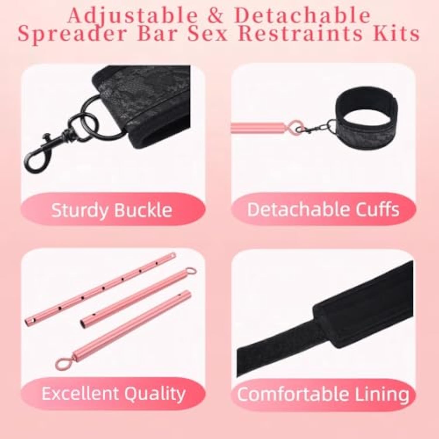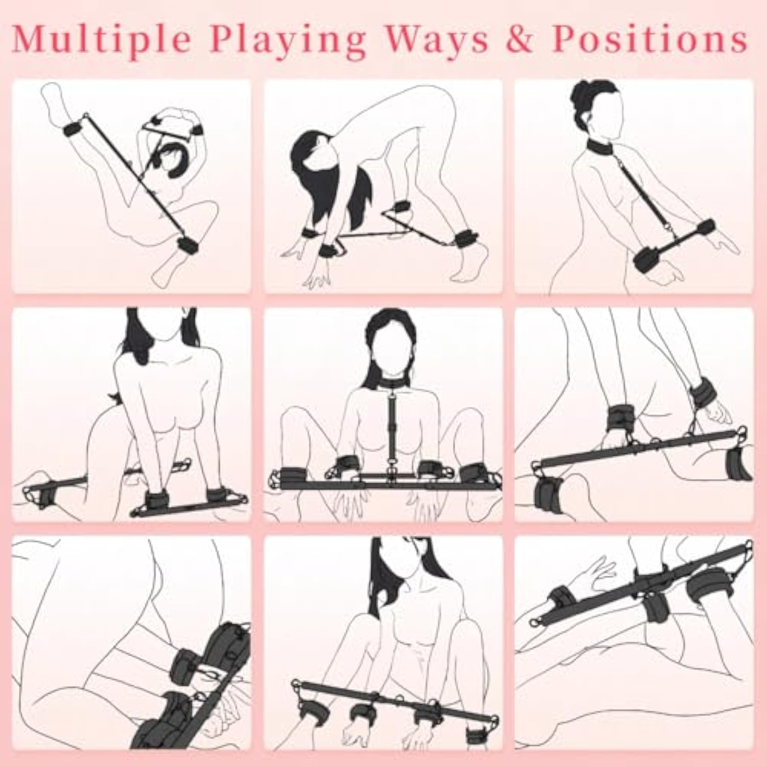 | Two Spreader Bars Bdsm Kits: Spreader Bar Provides Strength And Durability,Providing Comfort During Extended Use In Bondage Scenarios. The Collar Provides Additional Restraint And Can Be Attached To The Spreader Bar For More Advanced Bondage Positions | | Adjustability: Spreader Bar Offer Adjustable Lengths, Ranging From 22 To 36 Inches, To Cater To Different Body Sizes. The Ability To Adjust The Length Makes The Spreader Bar Ideal For A Wide Range Of Bondage Positions And Scenes, Providing Flexibility | | Role Play And Exploration: Spreader Bar Can Be Used In A Variety Of Bdsm Scenes, From Light Bondage To More Advanced Restraint Scenarios. They Are Often Combined With Other Toys Like Ropes Or Blindfolds. It Can Be Incorporated Into Role Playing Scenarios | | Restraint Your Love Life: This Sex Toy Offers A Unique Way To Introduce Excitement And Explore Newfound Pleasures With Your Partner. Light Bdsm Experiences Add A Thrilling Edge To Your Sexual Encounters, Intensifying Sensations And Heightening Intimacy | | Discreetly Packaged: The Bdsm Sex Toys Kit Is Discreetly Packaged To Ensure Your Privacy Is Safeguarded During Delivery And Storage. Get This Bdsm Restraint Sex Toys Kit And Indulge In Intimate Nights With Your Lover | |