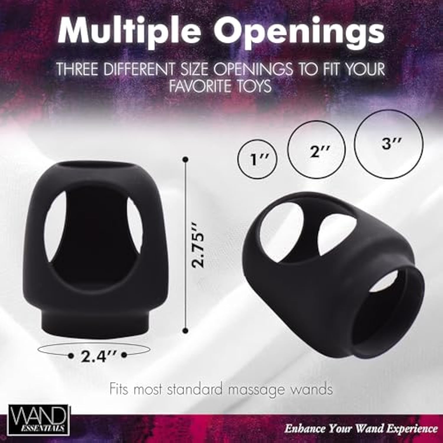 - Measurements: 3 Holes Total, 1, 2, And 3 Inches In Diameter; 2.4 Inches Total Diameter; Fits Most Standard Massage Wands, Dildo Sold Separately