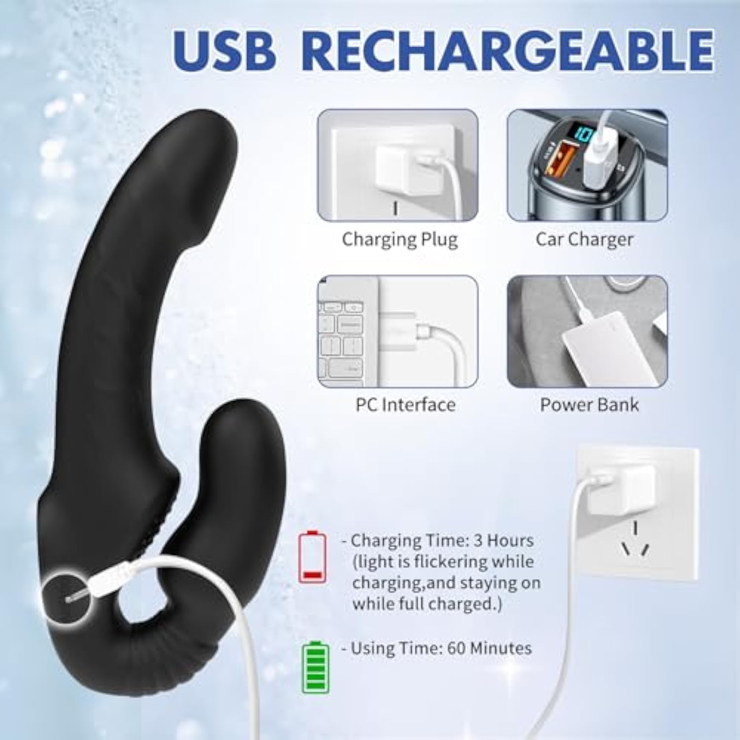 - ?Usb Rechargeable Ipx6 Waterproof?This Vibrator Could Be Charged By Phone Charger, Computer Or Power Bank. Charging Time Is About 3 Hours And Average Using Time Is About 60 Minutes. With The Deep Waterproof, It Is Easy To Clean, And You Could Enjoy A Sex Fun In The Shower.