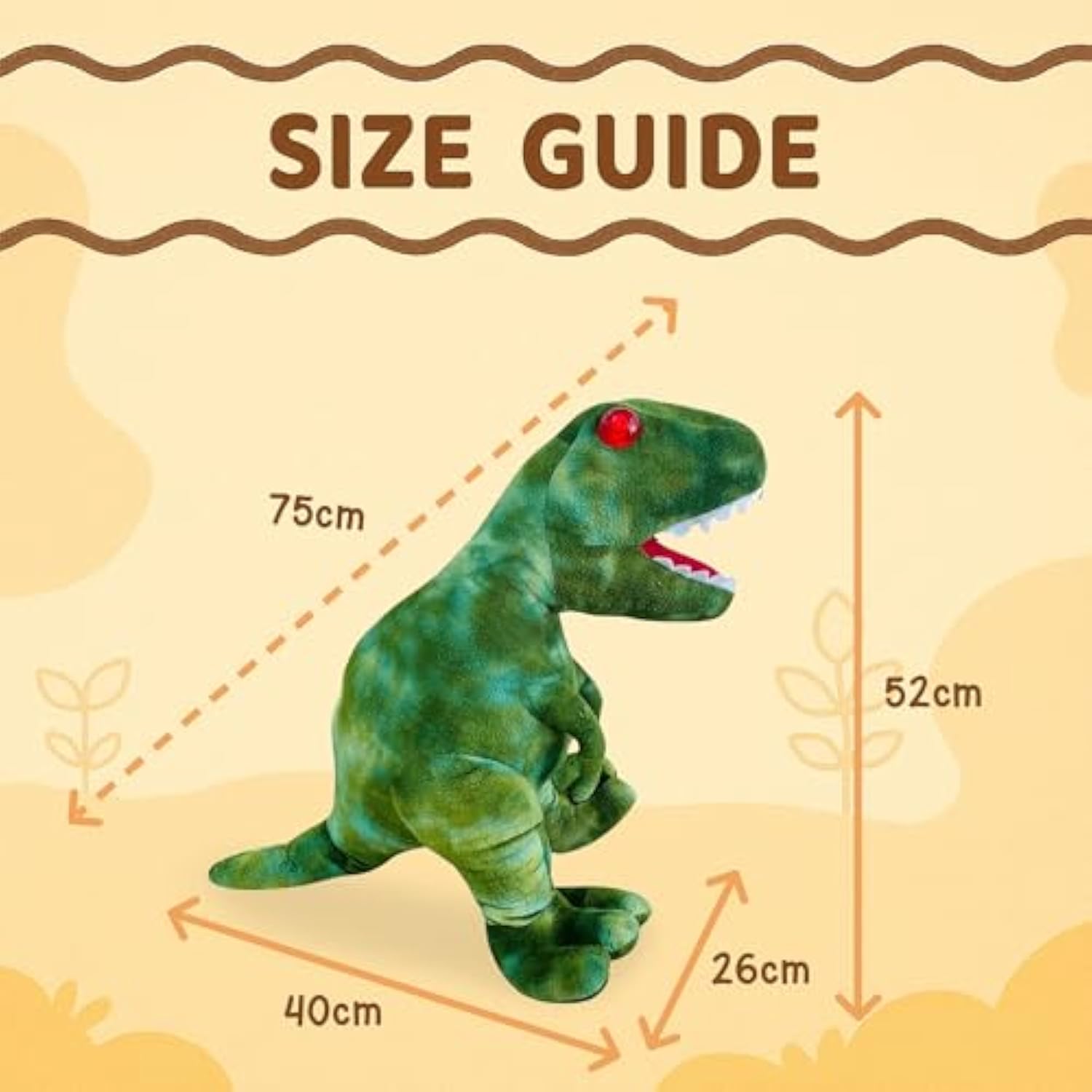 | [Cuddly Dinosaur Plush Toy] This 18 Inch Tall Dinosaur Plush Is A Perfect Cuddly Companion For Bedtime, Playtime Or Watching Movies. | | [T-Rex Plush Toy] Great For Dinosaur Fans And The Prehistoric World. | | [Interactive Talkback] Not Only Does The Large Dinosaur Plushie Have Sound Effects But Can Mimic Anything You Say In His Own Cartoonish Voice. | | [Promotes Speech] A Fun Toy Which Promotes Interaction And Speech With The Talkback Feature, Simply Press The Button And He'Ll Listen To What Noises Or Words You Make And Repeat Them Back In Funny Voice. | | [Premium Build] Made To A High Quality With Soft Material, Standing An Impressive 18 Inches / 45 Centimeters. | | [Requirements] 3X Aa Batteries For Interactive Features. Weighs 800G / 1.8 Lbs | |
