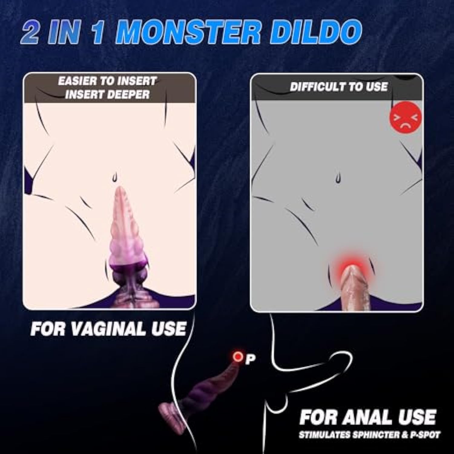 - Two-In-One Huge Dildo: Our Textured Dildo Can Be Used As An Anal Toy Or A G-Spot Dildo. The Tapered Dildo Is Easier To Penetrate Deeper Into The Vagina. The Knotted Buttplug Can Be Used As An Anal Stretcher To Stimulate The Male Sphincter