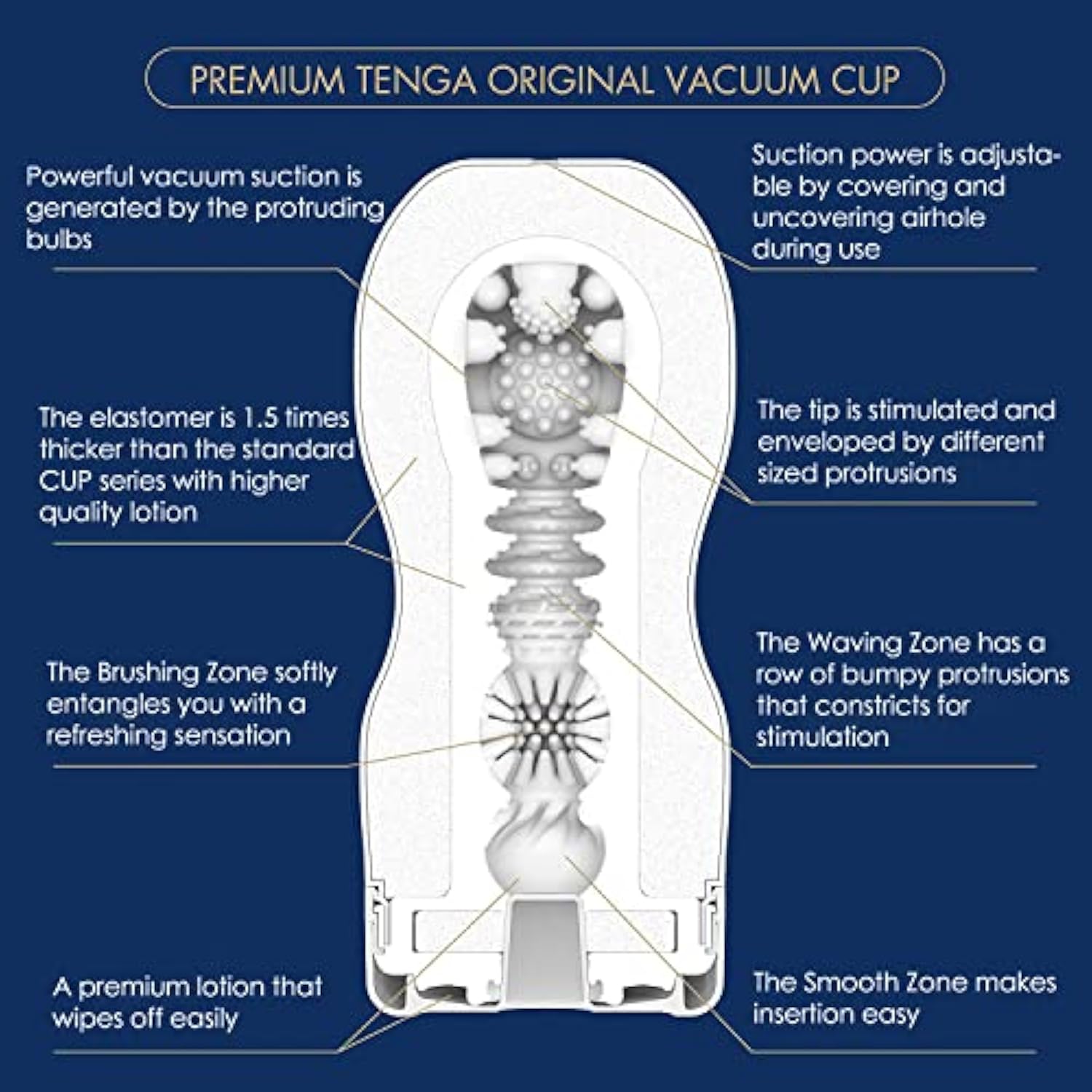 | Premium and Original TENGA male masturbators provide unmatched stimulation with vacuum suction, tightness, and revolutionary valve technology. | | Higher grade, 50% thicker elastomer on Premium version allows more luxurious sensation during use. | | Both easy to use - just open, enjoy, reclose, and dispose when finished. | | Hourglass shape and smooth pad insertion provide extra tightness, adherence, and automati