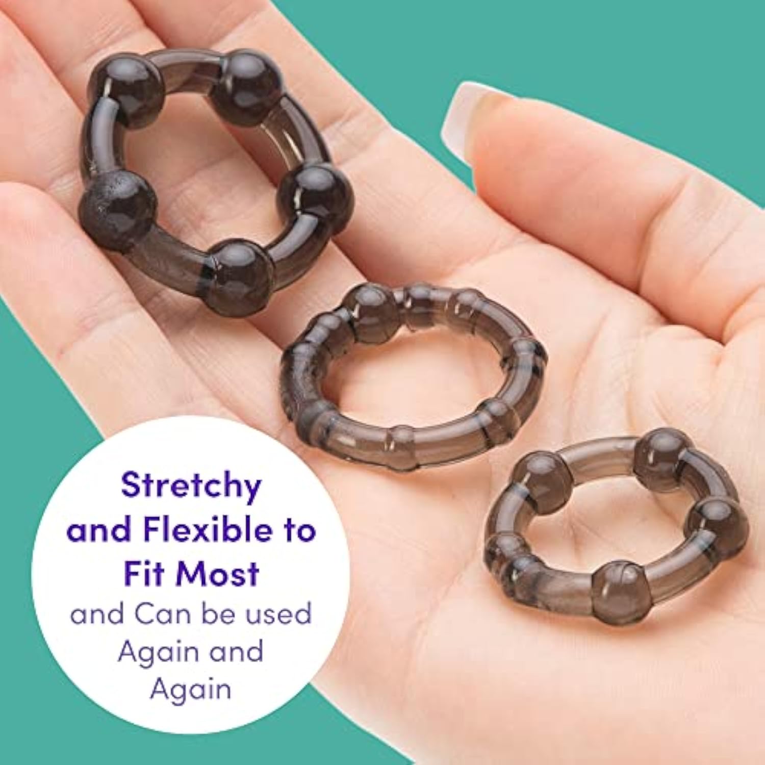 | Set Of 3 Stretchy Cock Rings Boost Your Sexual Stamina (Results May Vary): Stretchy And Flexible, This 3 Pack Of Cock Rings Are Designed To Help Enhance Erections And Optimise Staying Power. No S, As Results May Vary, But We Think You’Ll Like Them. | | Smooth Nubs On Each Ring Stimulate Partner During Penetration: These Cock Rings Each Feature Raised Nodules And Bumps For Heightened Sensation, And For Adding Clitoral Or Perineal Stimulation During Penetrative Sex. | | Wear In Different Combinations For Pleasurable Constriction: Apply A Good Squeeze Of Water-Based Lube To Yourself And The Inner Surface Of Your Chosen Cock Ring And Slide It To The Base Of Your Penis. | | Stretchy And Flexible To Fit Most And Can Be Used Again And Again: As You Become Harder, You'Ll Experience Gentle Pressure And Should Notice That Your Erection Is Bigger And Stronger Than Usual. Stretchy And Flexible, Penis Rings Will Fit Most Men And Can Be Used Again And Again. | | Waterproof:Submersible: Great For The Bedroom, And You Can Also Enjoy Your Cock Rings In The Bathroom. Ideal For Use In The Shower Or Bath, Enjoy Aquatic Exploits And Adventures With These Couples Sex Toys 100% Water Submersible Design. | |
