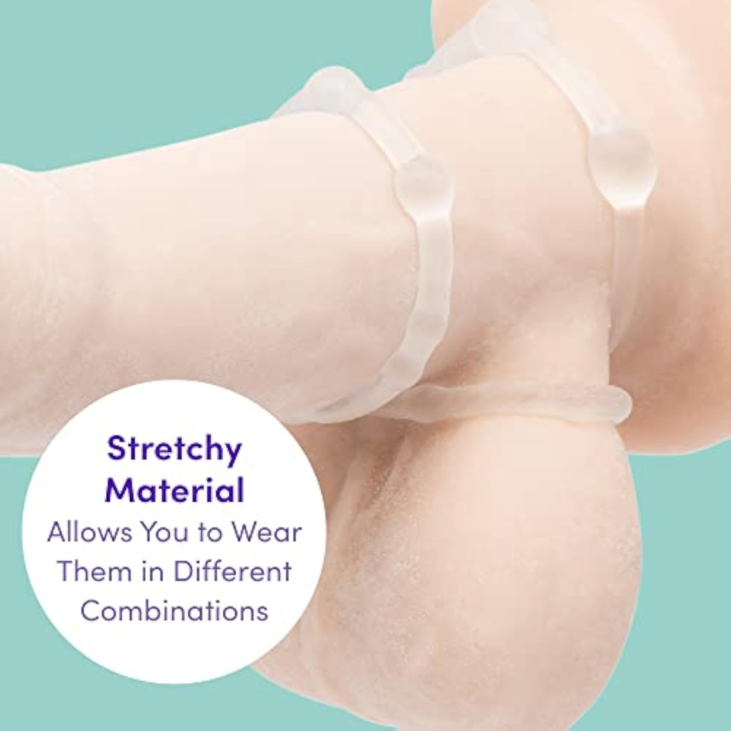 - Stretchy Material Allows You To Wear Them In Different Combinations: Just Stretch The Cock Ring Of Choice Over Your Penis, Roll It Gently Down To The Base And Experience A Firmer And More Powerful Erection That You'Ll Both Enjoy. These Penis Rings Can Be Worn In Different Combinations Around The Shaft And Testicles For Pleasurable Constriction.
