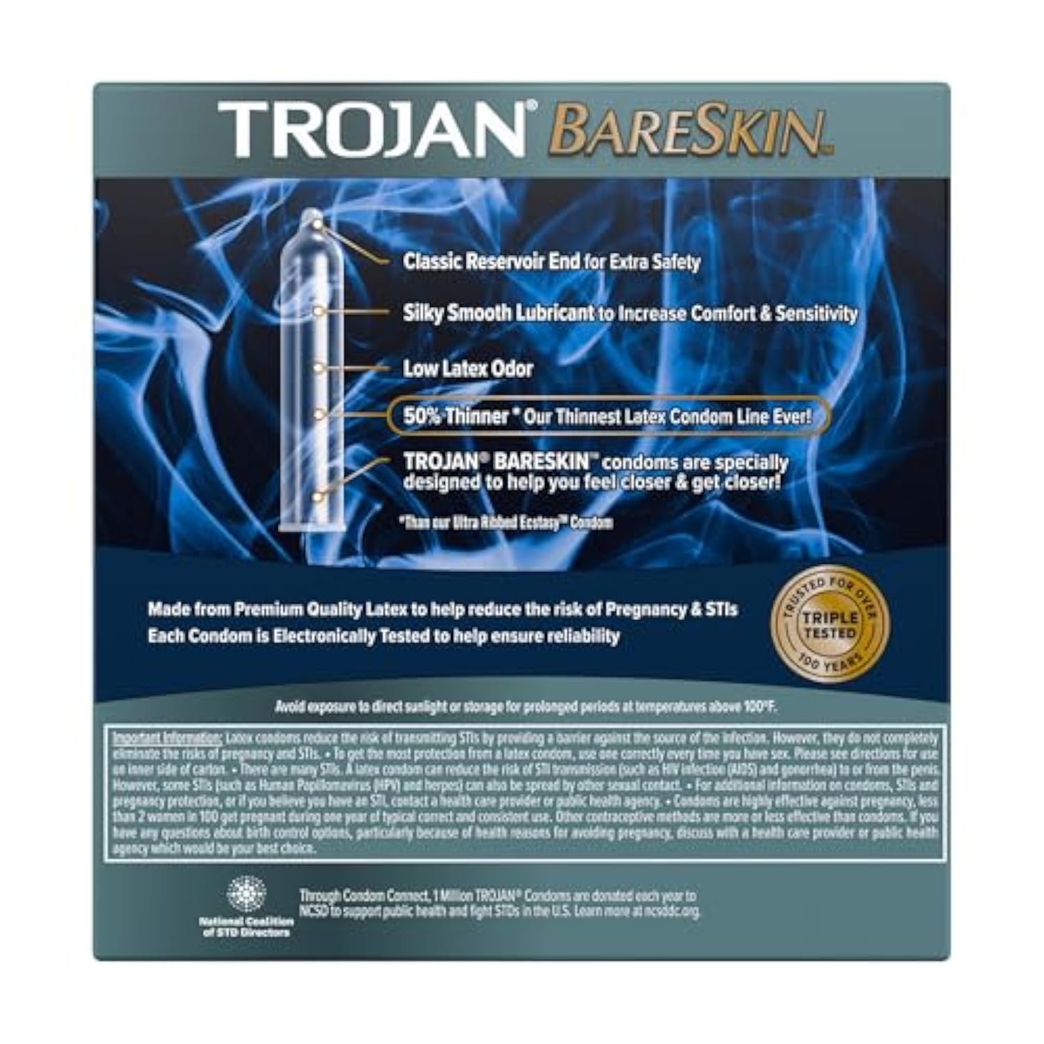 | Includes 24 ultra-thin TROJAN Bareskin condoms and a 5oz bottle of Astroglide water-based lubricant for enhanced comfort and pleasure. | | TROJAN Bareskin condoms are 50% thinner than standard condoms for increased sensitivity and intimacy. | | Astroglide lubricant mimics natural moisture to relieve vaginal dryness and discomfort. | | Latex condoms help reduce the risk of unintended pregnancy and sexually transmitted infections. | | Made in the USA, Astroglide lubricant is compatible with latex condoms and washes off easily with water. | |