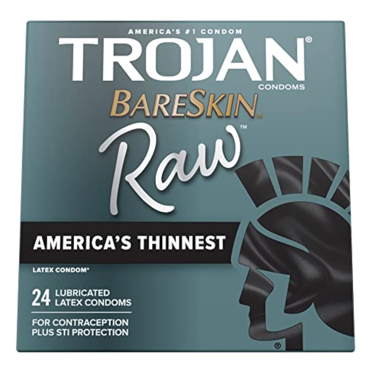 | Product 1: One 24 count box of TROJAN Sensitivity BARESKIN Condoms | | Product 1: 50% thinner than our Ultra Ribbed Ecstasy Condom | | Product 1: Silky smooth lubricant adds comfort and sensitivity | | Product 1: Premium quality latex that helps reduce the risk of unintended pregnancy and sexually transmitted infections (STIs) | | Product 2: One 24 count box of TROJAN BareSkin Raw Thin Condoms are America's thinnest latex condoms, so you can feel as if nothing is there without compromising on protection and safety when you use these lubricated condoms | | Product 2: These TROJAN BareSkin Condoms are America's thinnest latex condoms, designed to help you enjoy a more natural experience and feel it all | | Product 2: Low-odor latex condoms that feature a silky-smooth lubricant to help provide heightened sensitivity and comfort every time you play and allow you to feel as if nothing is there without compromising on protection and safety | | Product 2: These lubricated condoms for men are made from premium latex and electroni