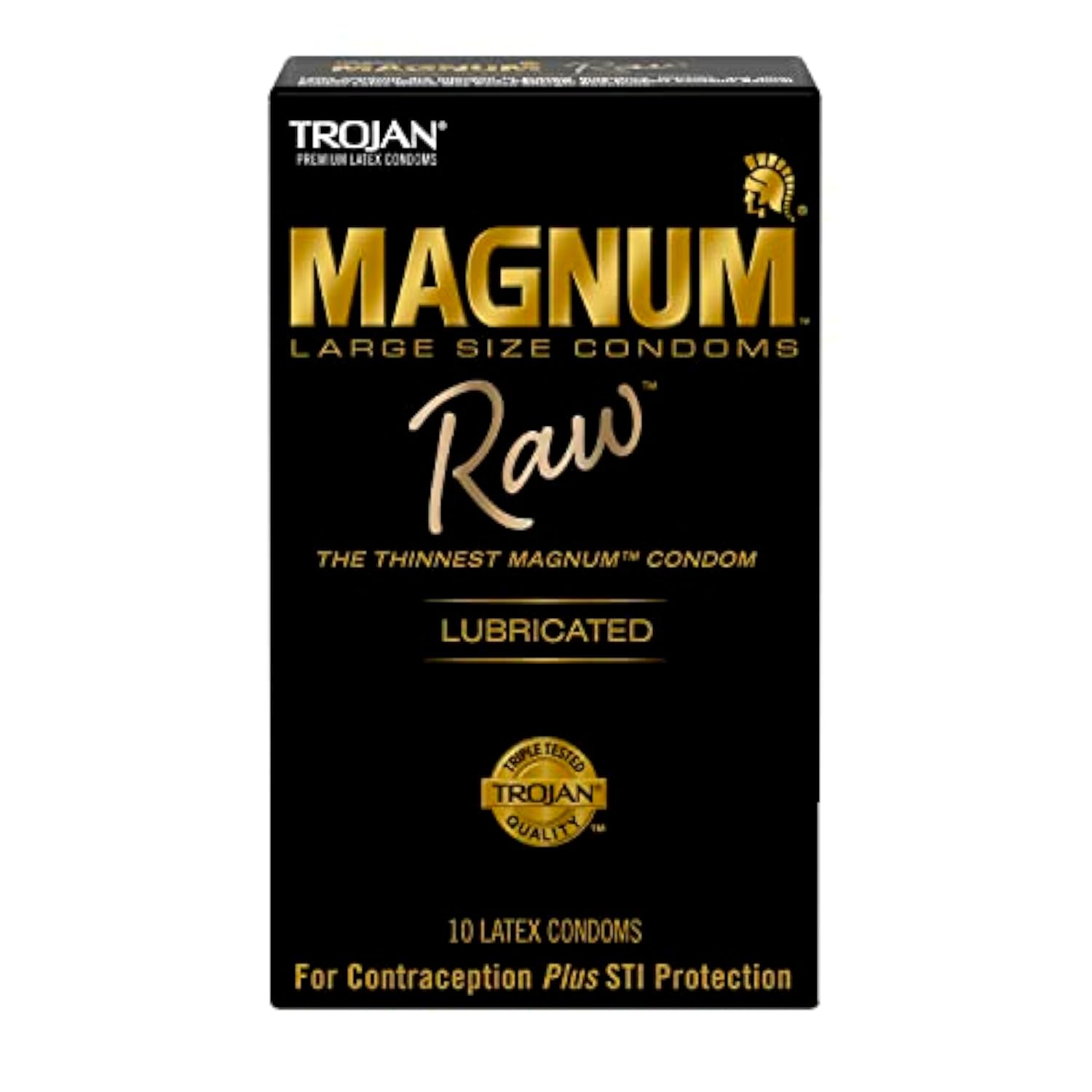 | The Gold Standard - Thinnest MAGNUM condoms from TROJAN brand for heightened sensitivity and comfort in a wider, contoured shape. | | Contains 10 TROJAN MAGNUM RAW and 10 TROJAN MAGNUM BARESKIN large condoms with silky smooth lubricant for extra comfort. | | Larger condoms provide more room with tapered base for secure fit and special reservoir end for extra safety. | | Made from premium latex, electroni