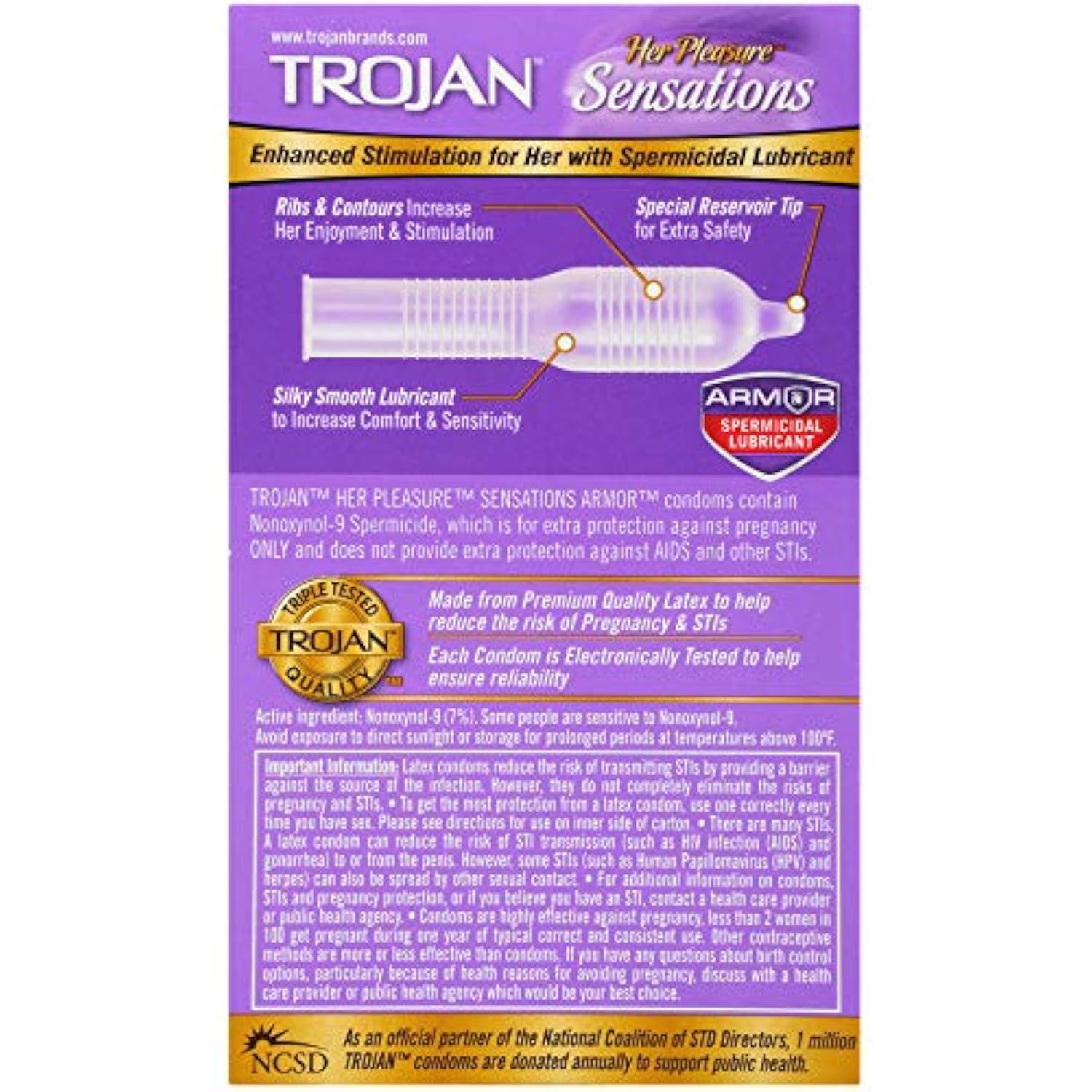 | The information below is per-pack only | | Designed from a woman's perspective to help heighten her sensation and pleasure, while providing extra comfort for him | | Nonoxynol-9 Spermicide is on this condom for extra protection against pregnancy ONLY - NOT for extra protection against HIV and other STIs | | Silky-smooth lubricant-for comfort and sensitivity | | Made from premium quality latex to help reduce the risk of pregnancy and STIs | | Each condom is electroni