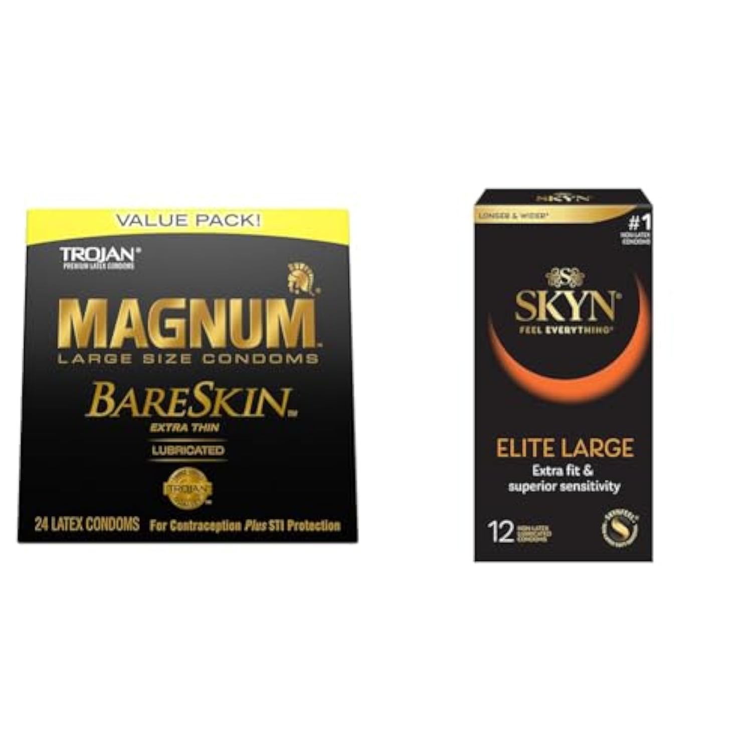 TROJAN Magnum BareSkin Premium Large Condoms, Comfortable and Smooth Lubricated Condoms for Men, America’s Number One Condom, 24 Count Value Pack & SKYN Polyisoprene Large Condoms, Natural, 12 Count