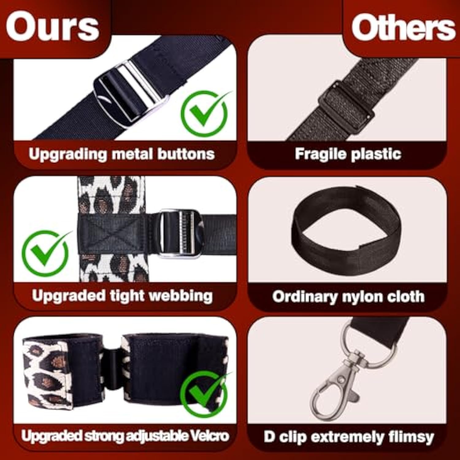 | Sex Bdsm Bondage Restraints Set: If You'Re Looking For The Ultimate Beginner Bondage Essential, Look No Further! Compared With Traditional Monotonous Bdsm Sets, This Leopard Print Bdsm Kit Can Not Only Meet Your Diverse Needs, You Can Use All The Accessories Together Or Separately, Bring Endless Fun For Tons Of Different Types Of Play | | Bdsm Neck To Wrist And Ankle Restraint: This Leopard Print Bondage Restraints Lets You Play In Dozens Of Wild Ways. There Are Two Wrist Cuffs, Two Ankle Cuffs, A Ball Gag, And A Collar. Combine With Other Bdsm Toys Like Blindfolds And Feather Paddle For A Genuine Dungeon Experience. The Restraints Are Perfect For Beginners And Bondage Enthusiasts | | Feather Paddle And Blindfold Bdsm Toys: The Sex Blindfold Fits Comfortably Over Your Partner'S Eyes, Immersing Them In Complete Darkness, Heightening Their Senses And Anticipation. Caress And Spank With The Smooth 2 In 1 Bdsm Paddle, Or Tease With The Titillating Feather Tickler For Kinky Sex Submission And Enhanced Sensations, Sparks Wild Fantasy Sex | | Fully Adjustable Size Bdsm Sex Toys: Each Cuff And Collar Adjusts With Velcro Closures For A Snug And Comfortable Fit. Velcro Fasteners Make Them Quickly And Easy To Remove. The Bdsm Cuffs Are Fully Adjustable, Adjust The Fit To A Comfortable Level And Enjoy The Mental And Physical Act Of Locking Away Your Sub For Your Whims. Both Of You Will Enjoy The Devious Kit | | Sturdy And Comfortable Sex Restraints: The Bondage Cuffs Made Of Sturdy Cotton Material That Is Soft And Gentle On The Skin, But Provides A Satisfying Feel And Aesthetic. And The Metal Buckles Is More Durability Which Can Stand Up To Most Styles Of Rougher Play. Locking Up Lover! Allow You To Strengthen Control Or Take Ownership. Don'T Worried That Your Slave Will Run Away | | Multiple Positions Bdsm Play Games: You Can Tie The Restraint Collar In Front Of Or Behind The Body, Handcuffs And Ankle Cuffs Can Also Be Used Alone, And Ribbons Can Be Used To Blindfold Or Tie Hold Your Wrists, The Collar Ball Gag Can Be Used With Handcuffs Ankle Cuffs. We Will Deliver It To You In Discreet Packaging That Does Not Contain Any Sensitive Information, Ensuring Your Privacy | |