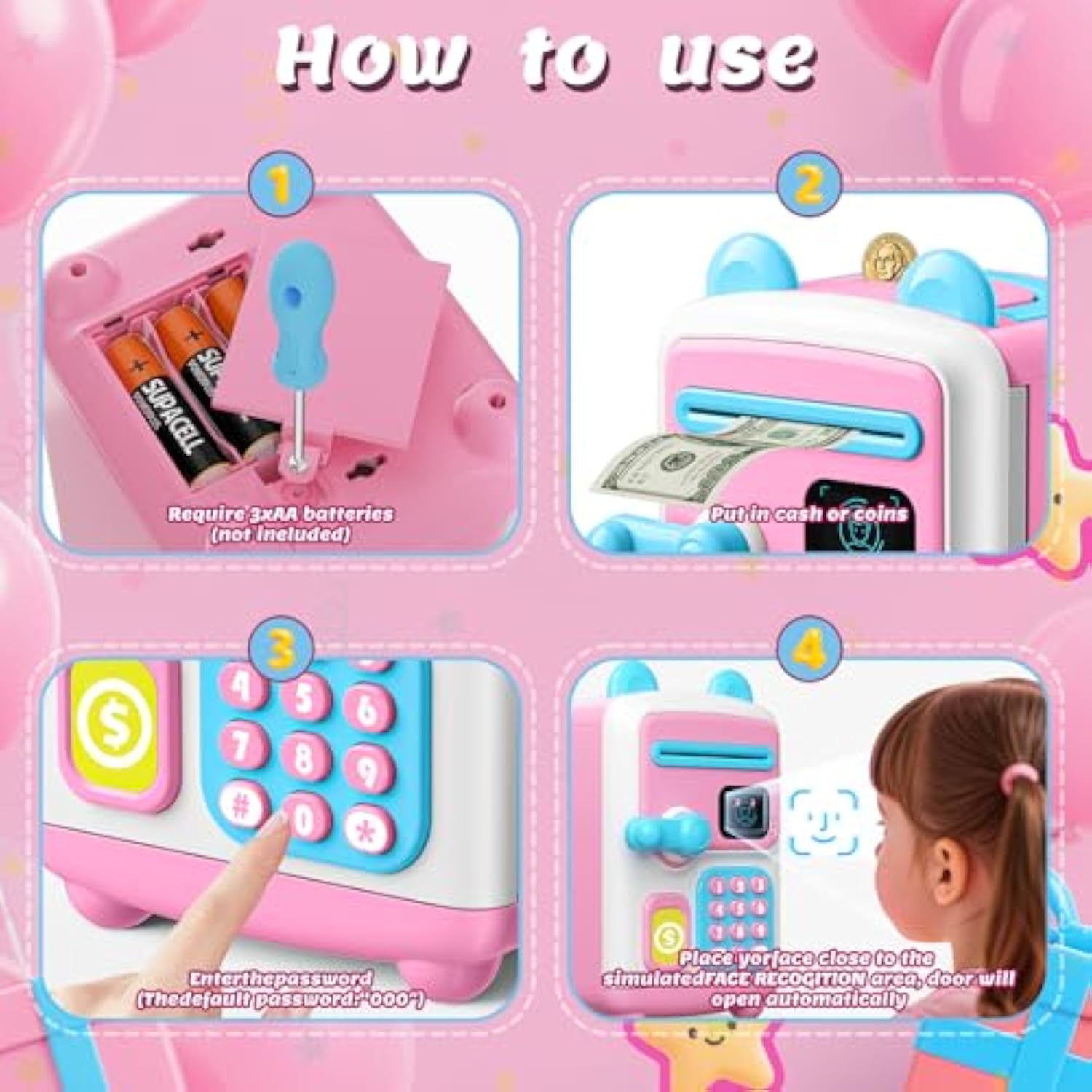 | High-Tech Password And Face Id Unlocking Function: This Atm Futuristic Piggy Bank Combines Password Protection And Playful Facial Recognition Tech—Just Let Them Punch In Their Secret 3-Digit Code And Scan Their Smile Under The Blinking Indicator Light To Access Their Stash. A Secure, Interactive Way To Teach Responsibility While Keeping Their Prized Coins, Toys, Or Treasures Safe. Watch Their Eyes Light Up As They Become Mini Security Experts—Saving Has Never Been This Cool Or High-Tech(Default: 000,Changable Passwords As You Like) | | High Quality Material?Durable And High Capacity: Made From Abs Plastic; Safe Simulation Design,No Odor And Sturdy And Not Break Easily; Piggy Bank Can Store 600 Pieces Of Coins Or 100 Pieces Of Paper Money. Make Children To Plan To Store Pocket Money,Greatly Helping Children Develop A Good Habit Of Saving Money (Applicable Batteries: 3 * 1.5V Aa Batteries (Not Included).) | | Automatic Paper Money Scroll: Insert The Banknote Into The Cash Deposit Slot Of The Children'S Atm Money Box, And The Banknote Will Be Automati