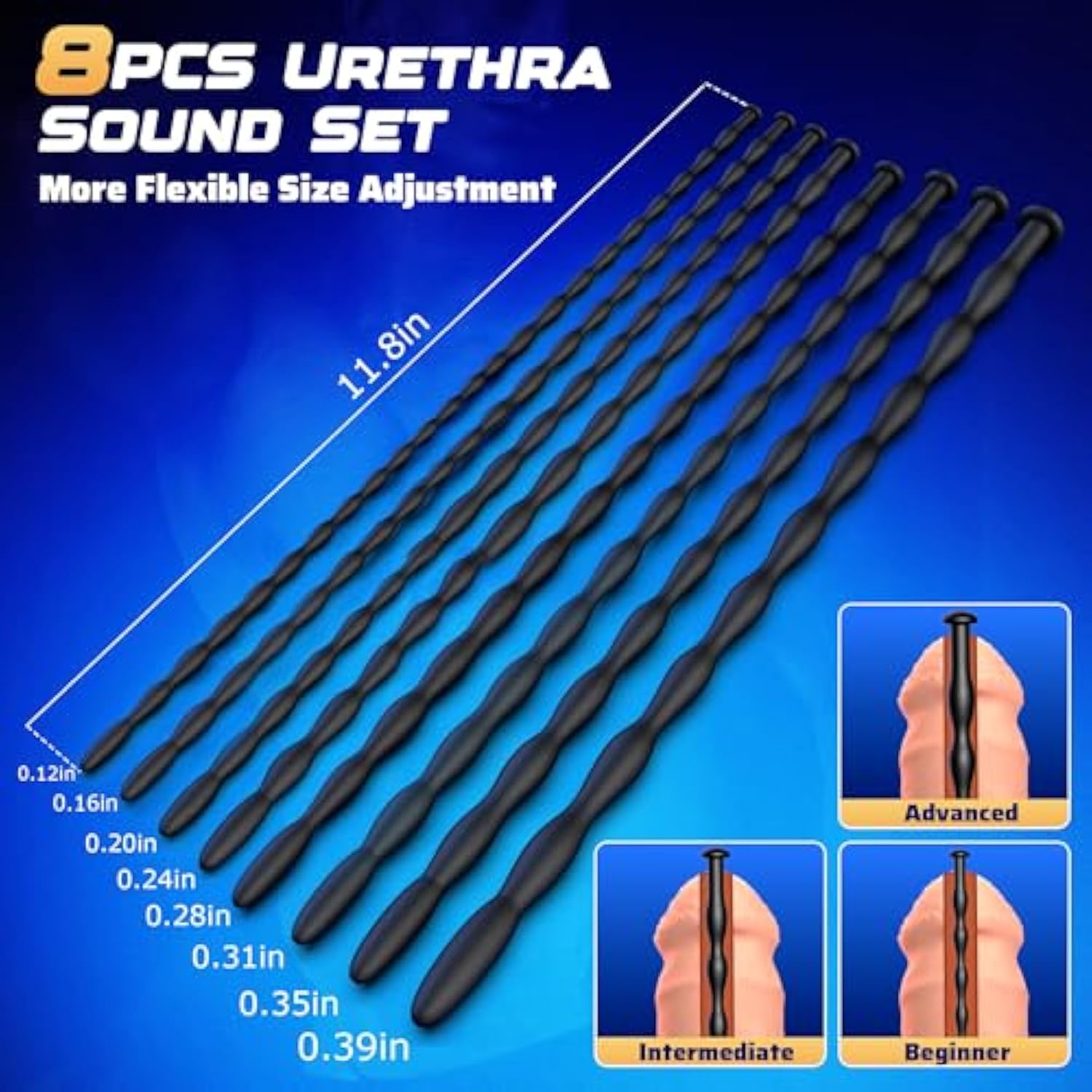| 8 Pcs Urethra Sound Sets For Personalized Training: The 0.12“ To 0.39” Diameter And Bead Textures Meet The Experience Level Of Beginners To Intermediate To Advanced Users, The 11.8" Flexible Silicone Urethral Plug Penis Toy Progressively Allowing You To Unleash Your Deepest Desires, Stretching, Teasing, And Stimulating Every Nerve In The Penis | | Flexible Soft Silicone Urethral Plug For Exploration Play: Body-Safe, Flexible Silicone Sounding Rods Urethra Dilators Easily Inserts Into The Penis, Giving You Secure Control Over The Tightest Curves Of The Urethra And Penetrating The Prostate, Delivering A Cozy, Throbbing Stretches For Male Sexual Pleasure | | Upgraded Seductive Smooth Penis Plug: Using The Latest Polishing Technology To Make The Surface Of The Catheters Sounds Set Smoother And Softer To Minimize Discomfort, Dilators Sounding Toy Slides Effortlessly Deeper, Awakening Raw, Pulsating Sensations As You Push Your Limits | | Ergonomi