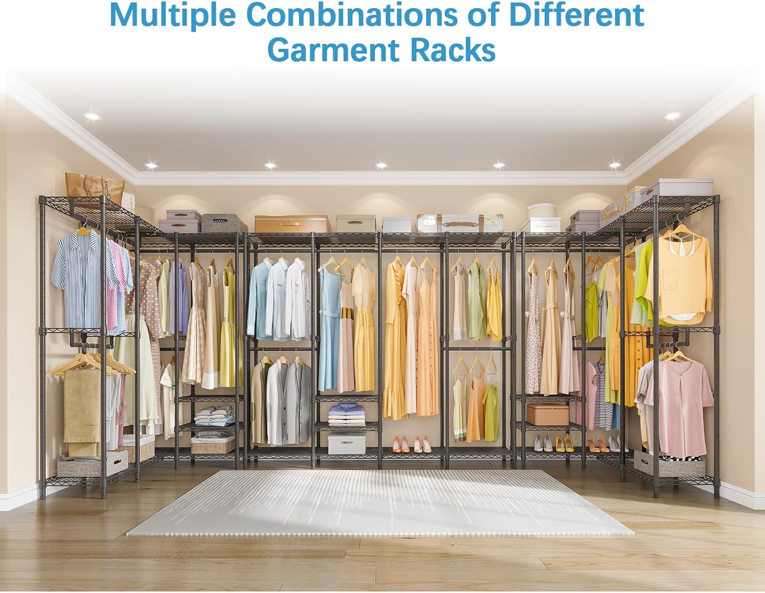 - All-in-one Multifunction Closet Rack: 4 Tiers Extra Large Garment Rack V40 offers you various storage area to place your clothes, accessories, shoes, etc. It features 6 height adjustable shelves for extra storage capacity, 4 detachable hanging bars that easily accommodates to the length and size of your garments.