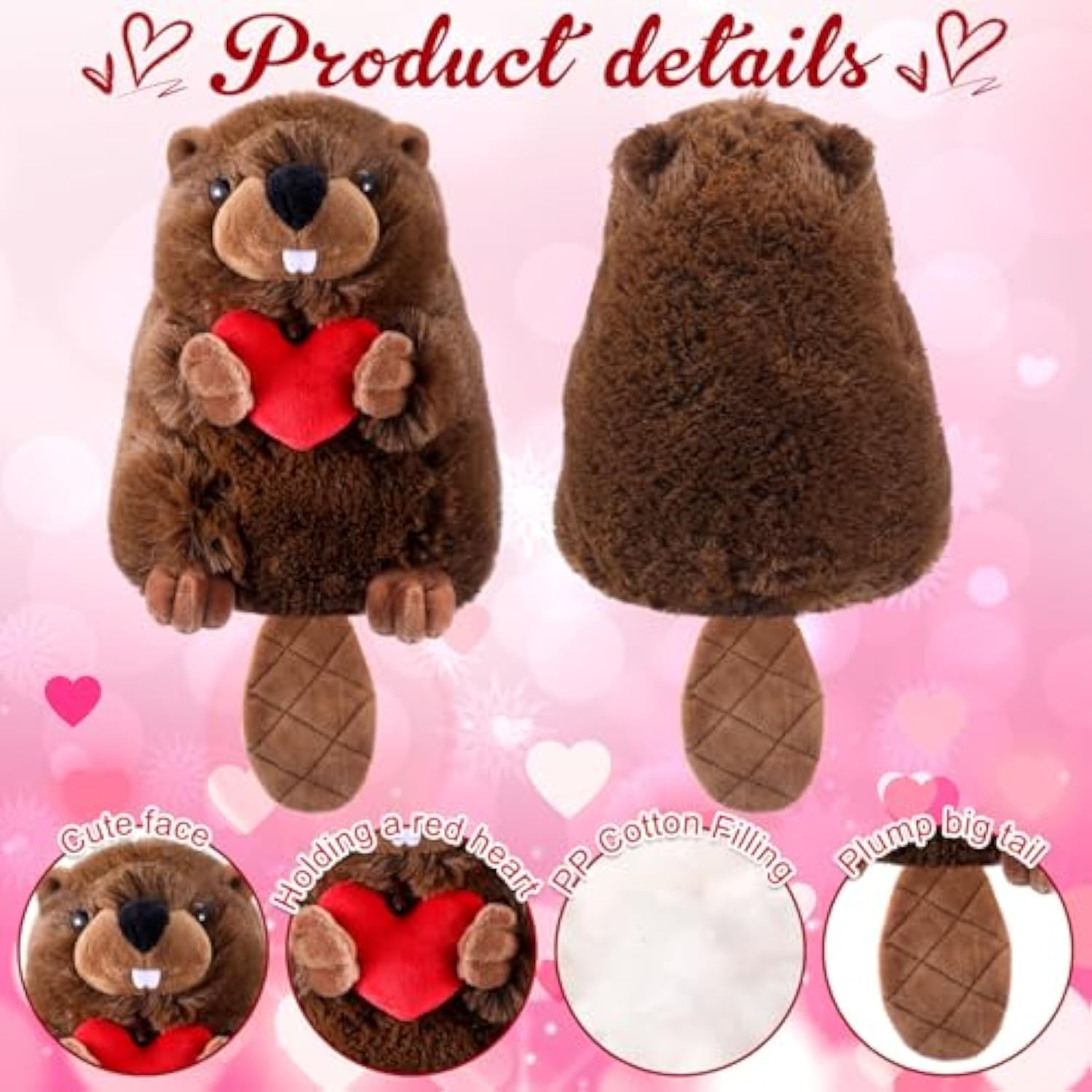 | Beaver Stuffed Animal: Featuring A Chubby Body, A Wide Flat Tail, And Holding A Heart In Its Tiny Paws, This Valentine'S Beaver Plush Is Designed With Irresistible Cuteness That Makes It The Perfect Symbol Of Love And Affection | | Exquisite Craftsmanship, Perfect Size: Standing Approximately 8 Inches Tall, This Beaver Plush Is Designed With Fluffy Fur And A Cute Texture, Ideal For Hugging And Snuggling; Its Realistic Facial Expression Design Gives It An Irresistible Charm, Making It A Unique Valentine'S Day Gift | | Soft, Safe, And Durable: Made With Plush Fabric And Filled With Pp Cotton, This Valentine'S Beaver Stuffed Animal Is Soft, Lightweight, And Resilient, Ensuring Long-Lasting Comfort; During , The Beaver May Be Slightly Compressed; Don'T Worry! Just Use A Hairdryer On A Cool Setting To Fluff Up Its Fur For That Extra Cuddly Feel | | A Heartfelt Gift Of Love: Beaver Stuffed Animal Are Social Animals That Usually Live In Pairs And Mate For Life; Whether Given To A Girlfriend, Boyfriend, Spouse, Or Best Friend, It Makes A Meaningful Valentine'S Gift That Conveys Warmth And Care | | Nice Decor For Love-Themed Spaces: With Its Brown Color And Heart Details, This Brown Beaver Plush Fits Beautifully In Bedrooms, Living Rooms, Or Offices; Whether Placed On Shelves, Beds, Or Desks, It Adds A Cozy And Romantic Valentine'S Atmosphere To Any Space | |
