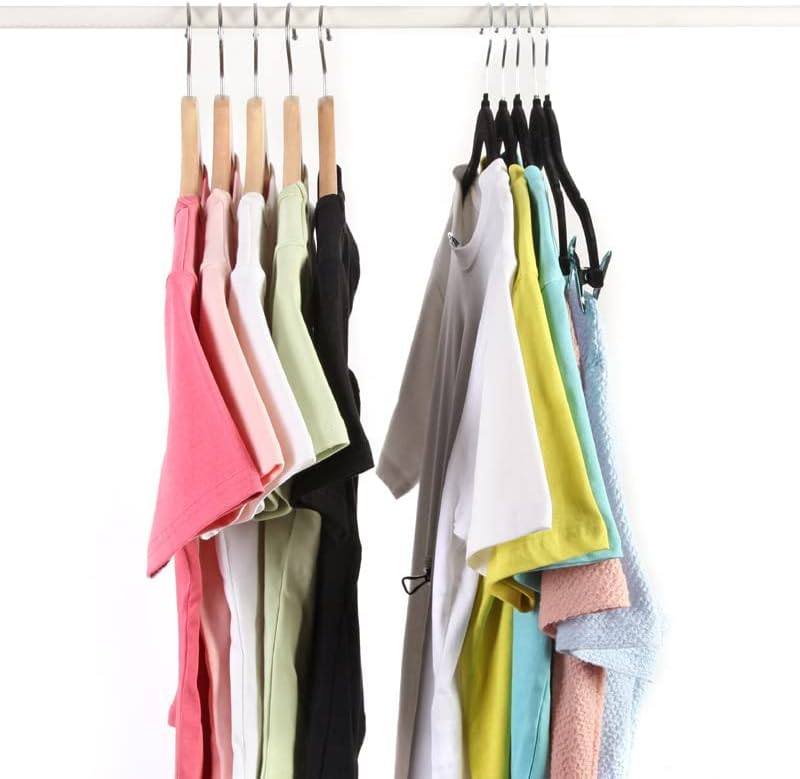 - The adjustable skirt hangers has movable clips. The width between the 2 clips is adjustable (Max.width can be 15"), and it makes the pant hangers with clips perfect for different sizes of pants and skirts. The pads of the jean hangers for closet prevent clothes from slipping, and kept clothes in position.