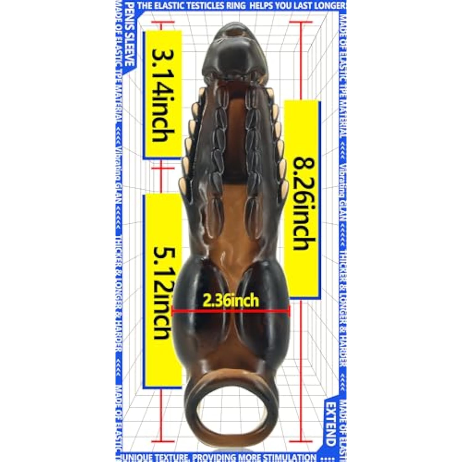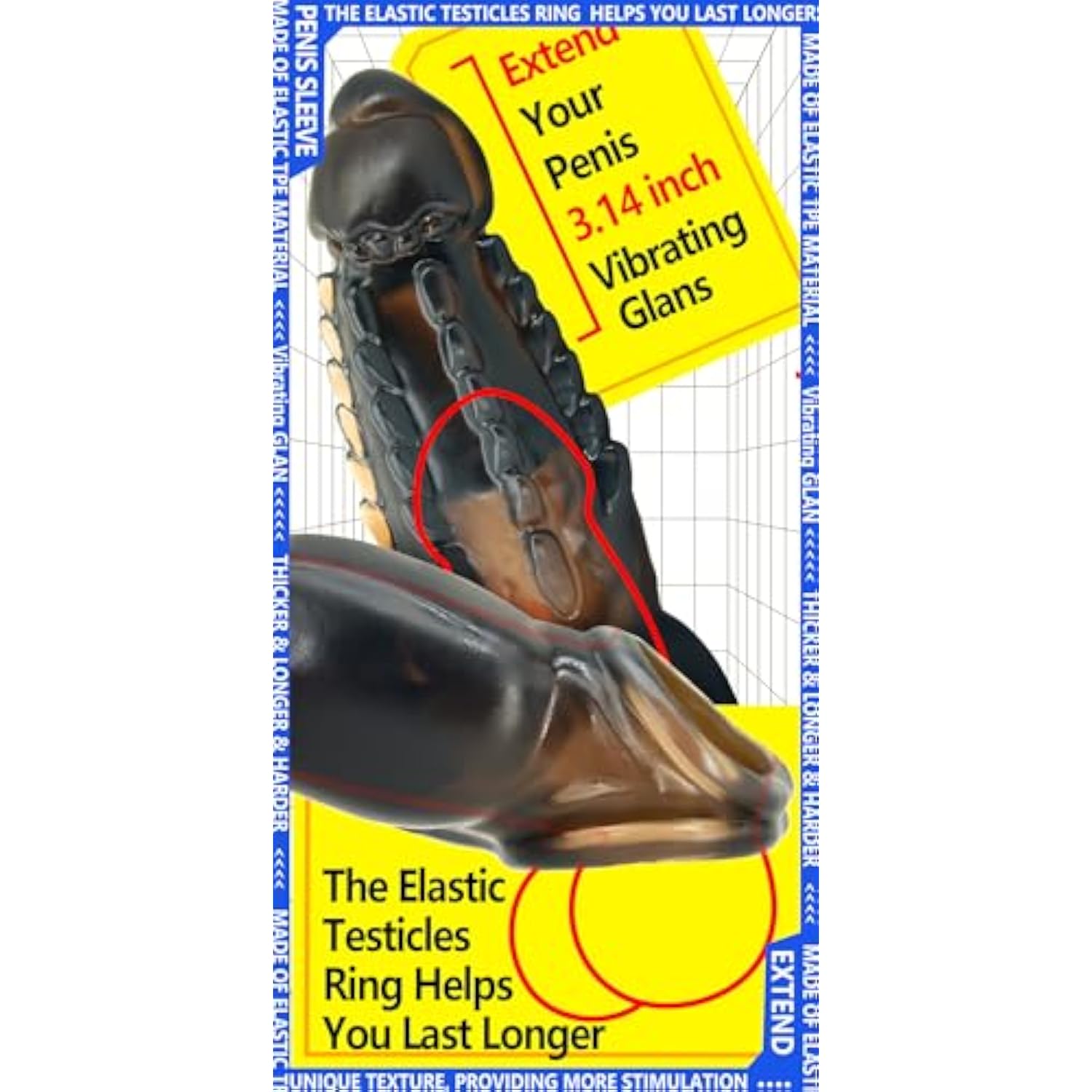 | Soft And Fleible Tpe Material: This Penis Sleeve Is Made Of Tpe Material, Non-Toxic And Odor Free. It Is Elastic, Can Lightly Fit Your Skin And Make You Feel More Comfortable. | | Cock Extender: This Cock Extender Will Help You Add About 3.14 Inches. It Will Help You Give Her Deeper Pleasure. | | Unique Shape: The Fascinating Thing About The Penis Enlarger Its Remarkable Unique Shaped Appearance. The Multiple Raised Barbs Will Give Her More Stimulation While The Knot Will Satisfy Her During Sex. | | Enjoyable Vibration: This Penis Sleeve Has A Built-In Bullet Vibrator. The Bullet Delivers Mind-Blowing Vibrations That Will Leave You Weak In The Knees. | | Testicles Ring: The Testicles Ring Will Hold The Sex Toy In Place. It Can Slow Down Your Blood Flow, Helps You Last Longer. | | Discrete Private: All Our Sex Toys Are Shipped In Plain Packaging With A Plain Postage Label To Protect Your Privacy. | |