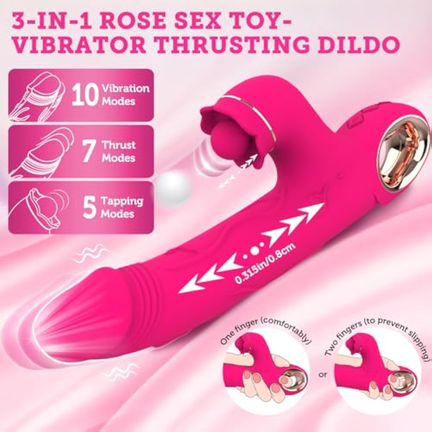 | ?3 In 1 Rose Vibrator?This Rose Sex Toys For Women Combines Three Modes: Vibration, Thrust And Tapping. It Has A Powerful Clitoral Massage Function To Stimulate Your Sensitive Parts To Reach Orgasm Faster, Making It A Great Adult Sex Toys Games Couples For Beginners Or Professional Players. | | ?5 Tapping Modes?This New Technology Tapping Vibrator Adult Toys Has Five Tapping Modes. This Thrusting Dildo Differs From Other Rose Sex Toys Because Of Its Unique Pulsations To Provide With 5 Amazing Tapping Pleasures. Female Thrusting Vibrators Used Simultaneously Provide The Ultimate Internal And External Triple Pleasure. | | ?3 Powerful Motors, 3 Independent Modes?The Rabbit Women'S Sex Toys Features 3 Strong Motors With Three Independently Switched Modes With 7 Strong Thrust And 10 Vibradores And 5 Pulsing Modes, Which Makes It Powerful And Easier To Meet The Orgasm Needs.This G Spot Vibrator Can Stimulate Your C And G Points At The Same Time To Reach Orgasm Faster, With Multiple Clitoral Stimulator Modes Allowing The User To Experience The Climax Experience From The Ground To The Air. | | ?Ergonomic Appearance Design?This Thrusting Vibrator Has An Ergonomic Design: Exquisite Size, Unique Shape And Texture. The Style Of The Small Ball Wrapped In A Rose, Which Is Stylish And Stimulates Your C-Spot. The Unique Two-Finger Grip Shape Enhances Grip, Is Easy To Use Force And Is Not Easy To Slip Off, And The Sexual Pleasure Process Will Not Be Interrupted. This Thrusting Dildo Lifelike Glans And Vivid Penis Texture Brings You More Stimulation And A More Realistic Sexual Experience. | | ?Body-Safe Siliconeusb Rechargeable?The Female Vibrating Dildos Are Made Of Premium Body-Safe Silicone, More Comfortable To Touch And Use. The Rabbit Rose Vibrator Use Usb Charging, Which Has Multiple Charging Methods, Making It Very Convenient To Find A Charging Socket And Charging Quickly. So That Your Happy Time Does Not Have To Wait Too Long. The 90-Mins Using Time On A Full Charge And The Powerful Thrust Vibration Function Allow You To Experience The Wonderful Orgasm Again And Again. | | ?Discreet Package, Privacy Protection?The Female Sex Toys Vibrator Are Designed To Be Relatively Silent, Allowing Users To Enjoy Pleasure Anytime And Anywhere Without Disturbing Others. All Adult Toy Vibrators Are Shipped In Discreet Packaging To Strictly Protect The Privacy Of Confidential Users. Please