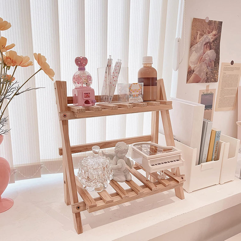 Wooden Double Layer Rack Desk Storage Organizer, Foldable Wooden 2-Tier Ladder S