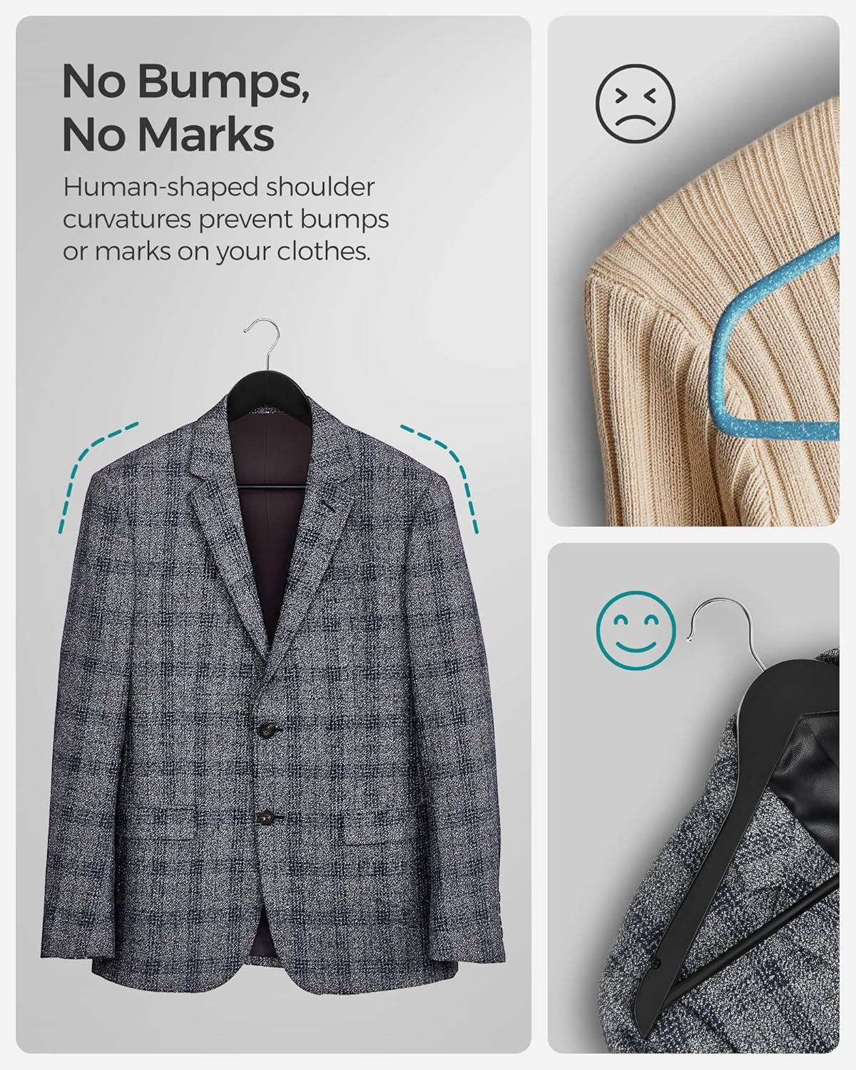 - [Bye Bye Bumps] Finally, you can bid farewell to the embarrassing shoulder bumps on your shirts; with a similar curvature to human shoulders, these coat hangers can take good care of your clothes and keep you looking sharp