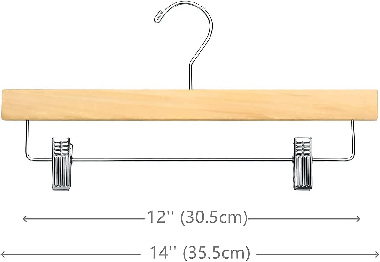 - ăMEASUREMENTăEach wood pant hangers size:14"W X 6.7"H X 0.47"T. Pack of 25pcs.Natural wooden pants skirts hangers with 360° swivel hook and stainless steel clips.The surface is smooth and burr-free, creating exquisite storage closet space.