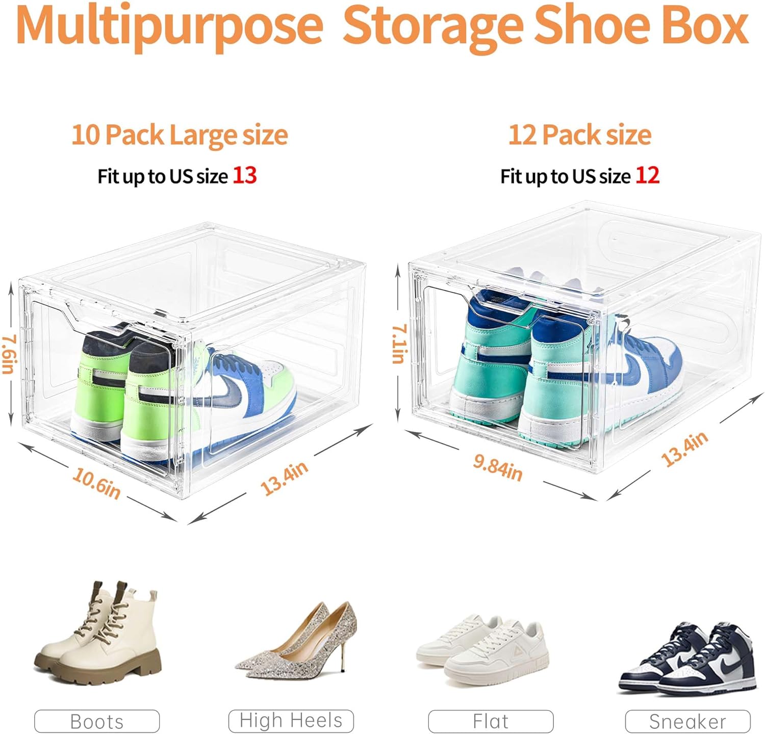 - â EXTRA LARGE CAPACITY - The upgraded shoe box each size is 13.4â x 10.6â x 7.6â, fits womenâs and menâs shoes up to size 13(US), which is suitable for many types of shoes such as boots, leisure, sneakers and high heels. Specially designed to stack securely, they serve as a great storage option for crafts, office supplies, toys and toiletries.