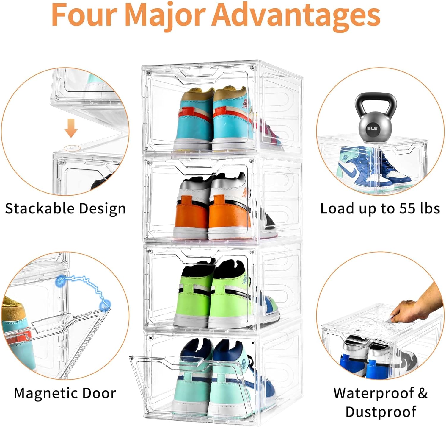 X-Large 10 Pack Clear Shoe Storage Organizer, Stackable Shoe Rack for Closet,Plastic Shoe Boxes with Magnetic Door,Dustproof Shoe Cabinet Sneaker Container for Women/Men,Fit up to US Size 13